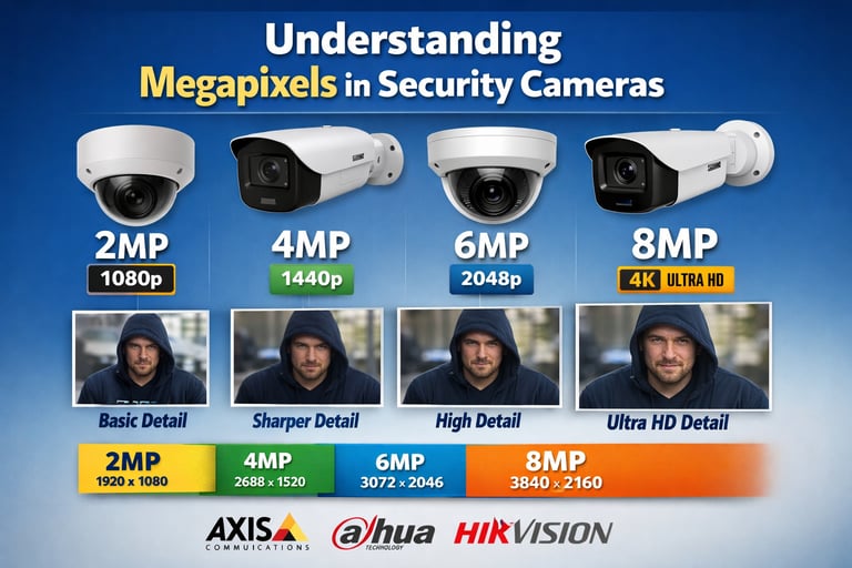 This guide breaks down what you actually get from 2MP, 4MP, 6MP and 8MP, how they impact identification, storage, and low-light performance, and how the major brands AXIS Communications, Dahua, and Hikvision support each resolution tier.